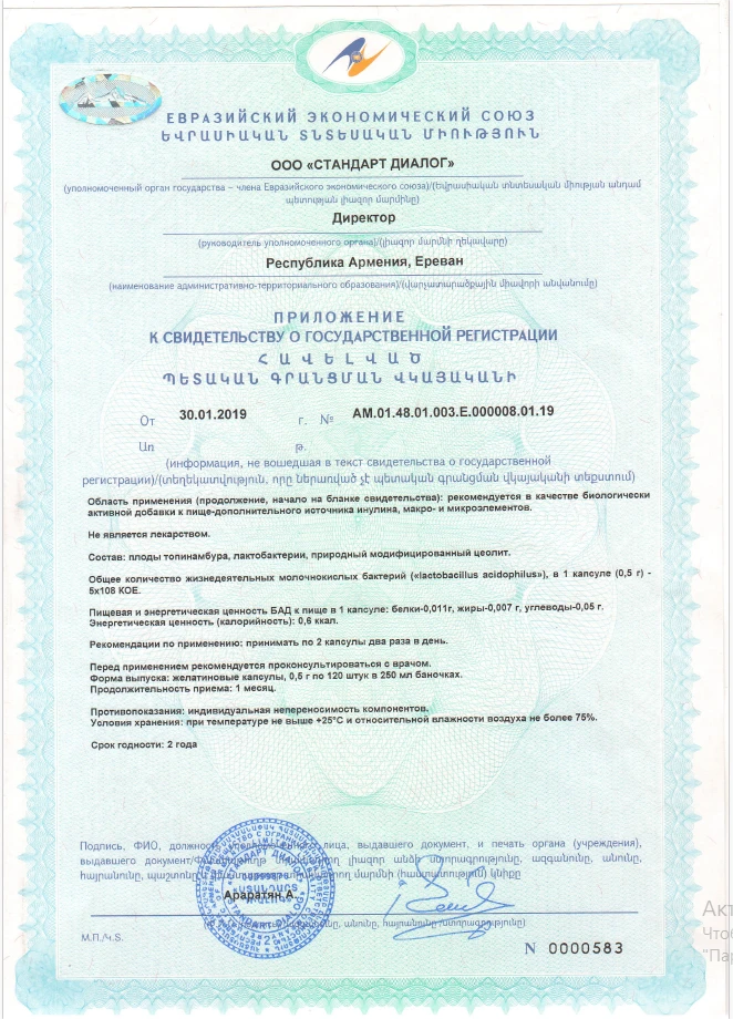 Կաթնաթթվային բակտերիաների բջիջները ադսորբցված են ակտիվացրած ցեոլիտների վրա։ Պրեբիոտիկը ստանում ենք պատենտավորված տեխնոլոգիայով գետնախնձորից, որն աճեցվում է հատուկ վերահսկողությամբ, բացառելով որևէ քիմիական պարարտանյութի օգտագործումը: 100%-ոց բնական պրեբիոտիկ է։